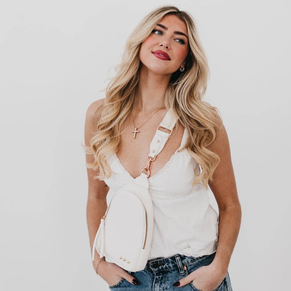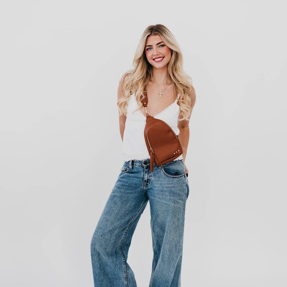 Meet your new favorite... our Adventure Awaits Sling Bag! This versatile bag will be here for all your adventures as you can wear it for any and all occasions. It comes with a removable solid canvas strap, open interior pocket, and sliding O-ring for ultimate convenience while it allows you to wear your sling bag on either side of your body. This must-have accessory will never fail you! The Adventure Awaits Sling Bag is another addition to our 3 Sisters Collection! This collection is inspired by the unbreakable bond shared between 2 sisters. These bags are marked with three signature studs and will complete outfits, catch eyes, and remind wearers of the incredible connection to their own sisters, whether through blood or by choice. You can see it in our inspiration and mission. Bag Measurements: 7"L x 2"W x 11.5"H Strap Measurements: 31