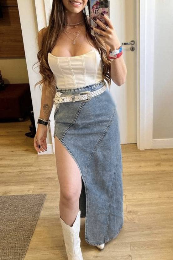 Introducing our high slit denim skirt - the perfect combination of style and comfort. Made with high-quality denim, this skirt features a trendy high slit design for a chic and modern look. Elevate your wardrobe with this versatile and effortlessly stylish skirt.