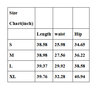 Size Chart(inch) Length waist Hip S 38.58 25.98 34.65 M 38.98 27.56 36.22 L 39.37 29.92 38.58 XL 39.76 32.28 40.94