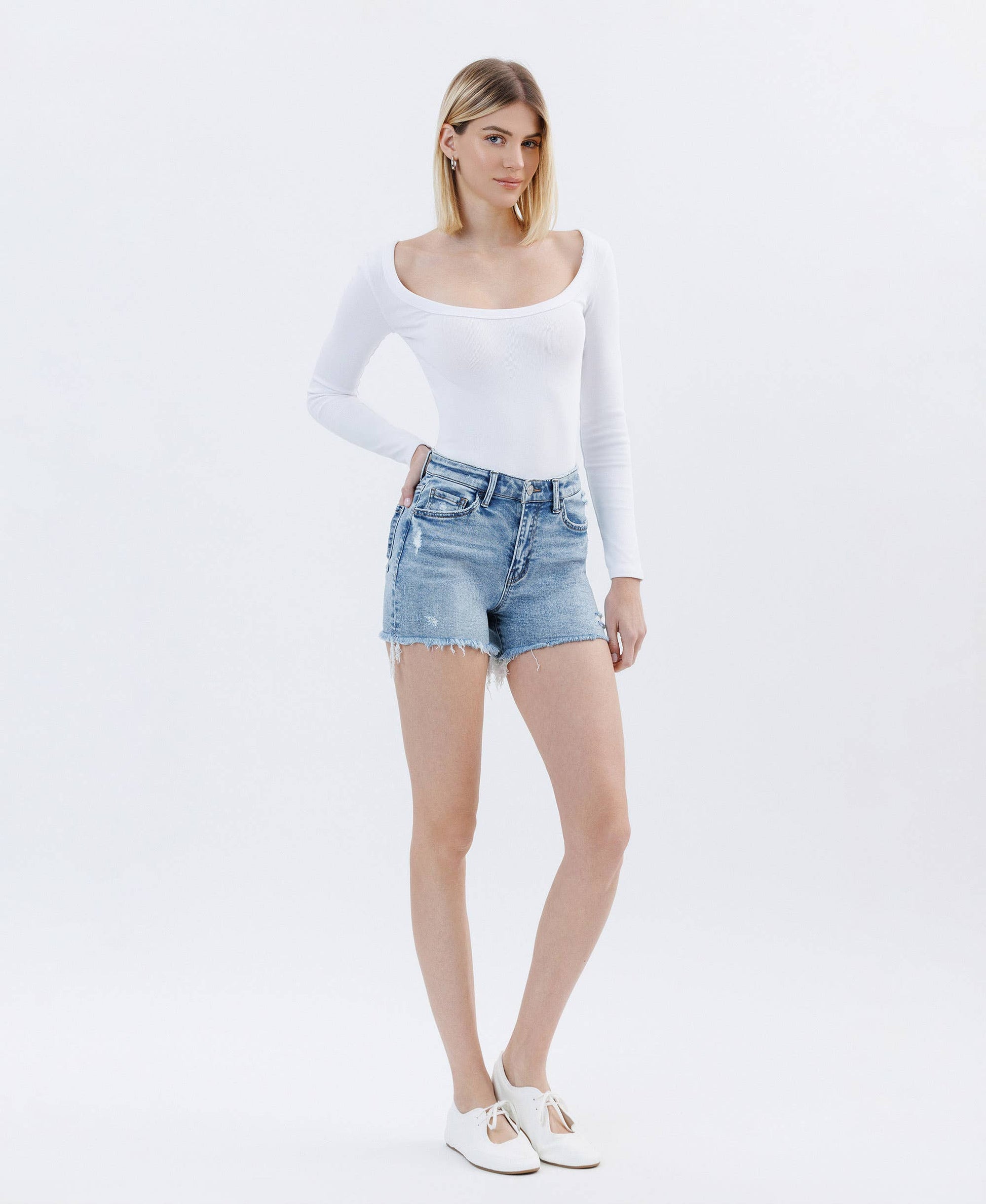 HIGH RISE DISTRESSED REGULAR DENIM SHORTS (PREš¤ORDER)