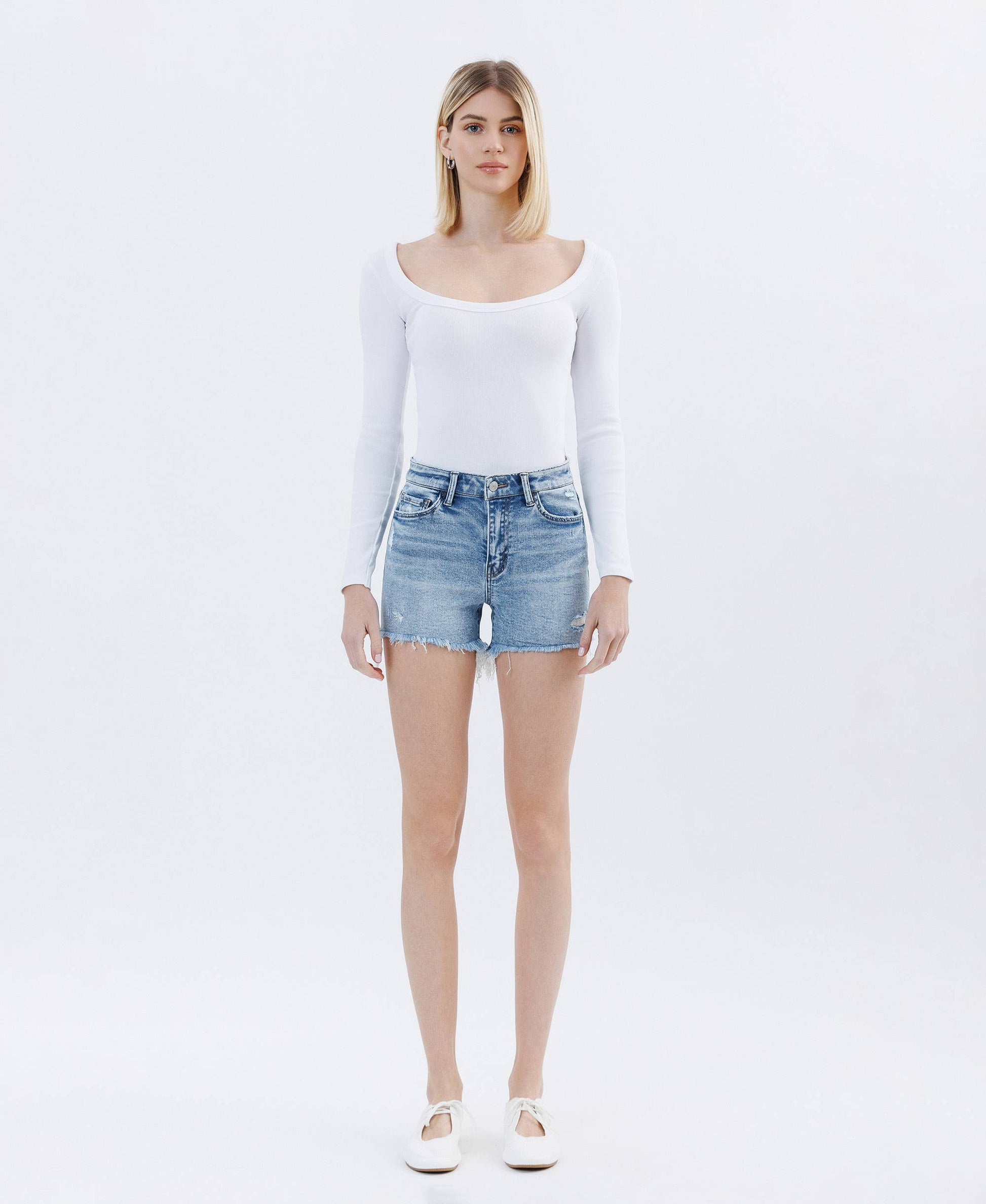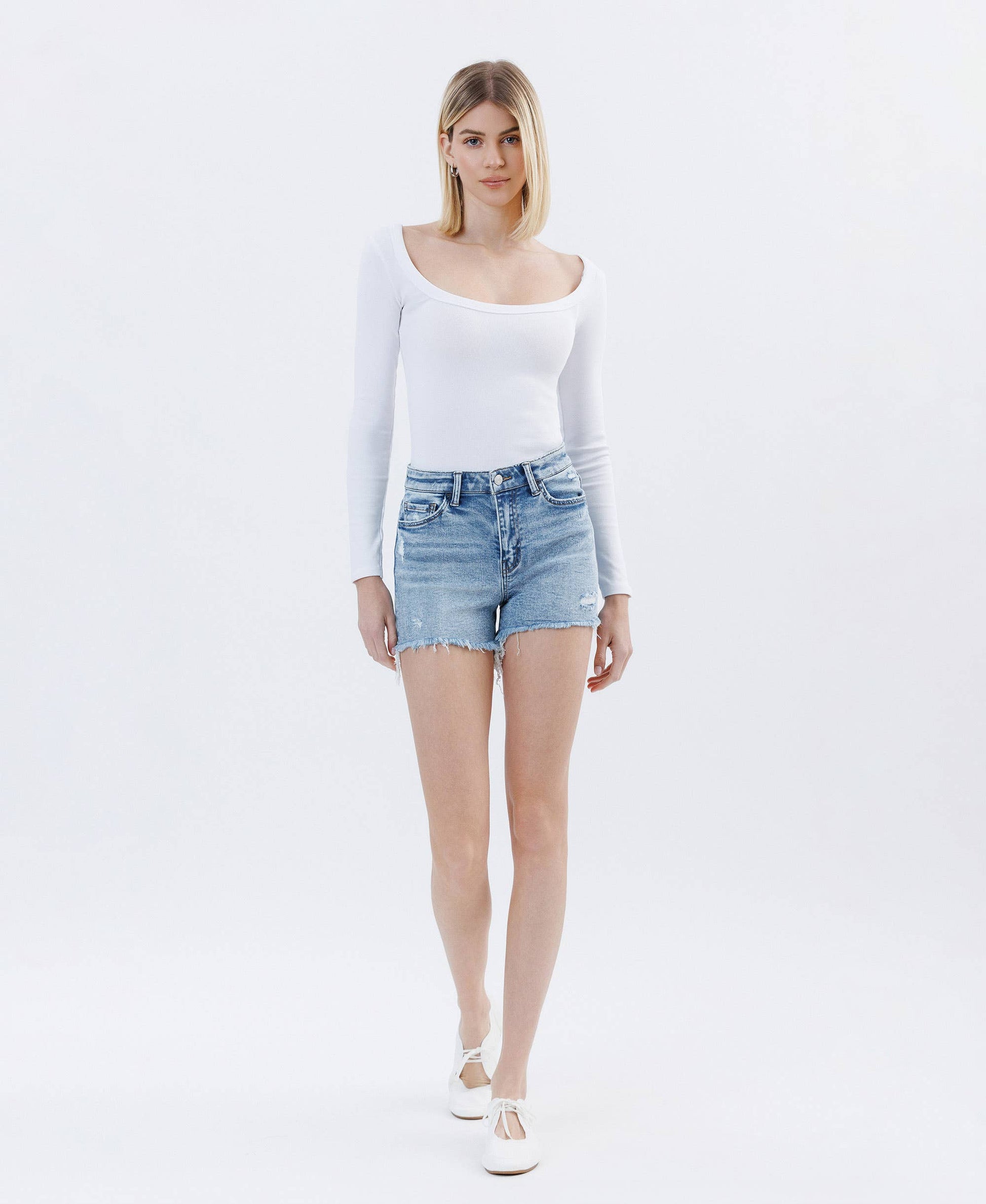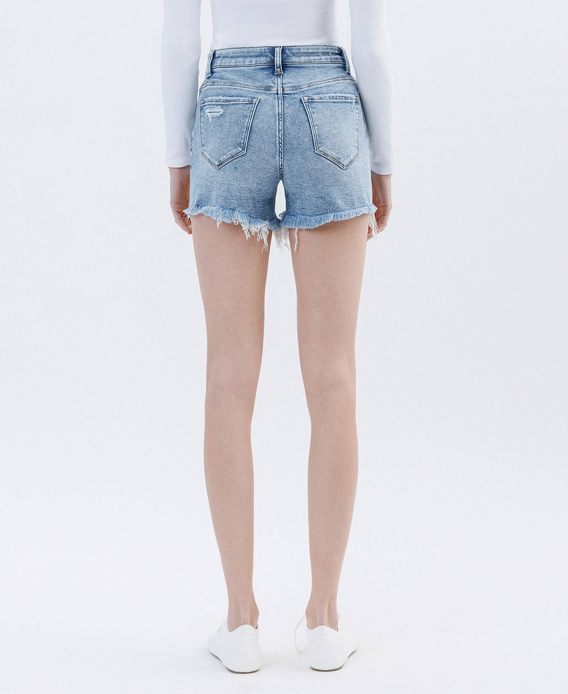 COMFORT STRETCH DENIM, HIGH RISE WAIST, 5 POCKETS, DISTRESSED DETAIL, FRAYED HEM, LIGHT WASH, REGULAR DENIM SHORTS