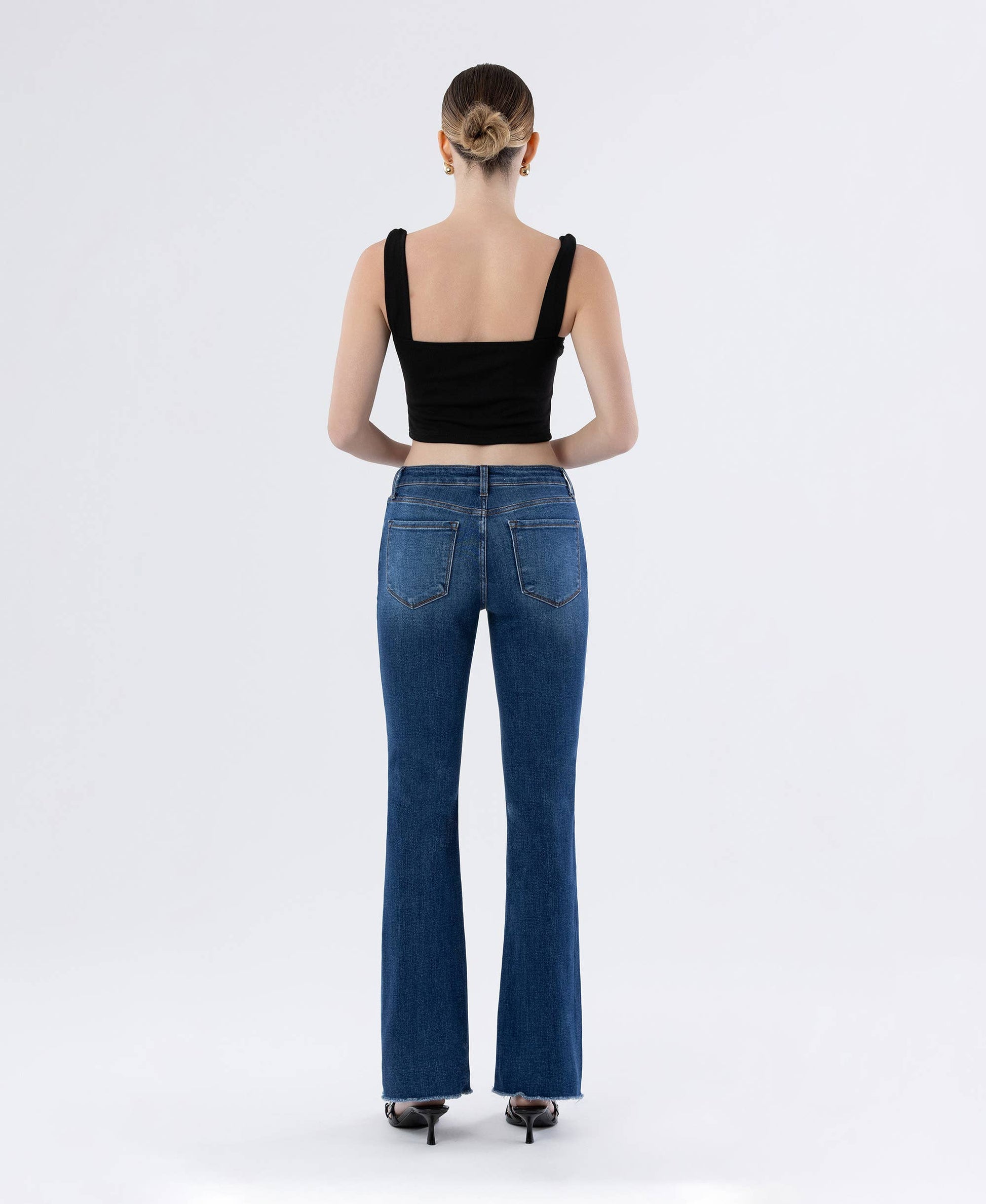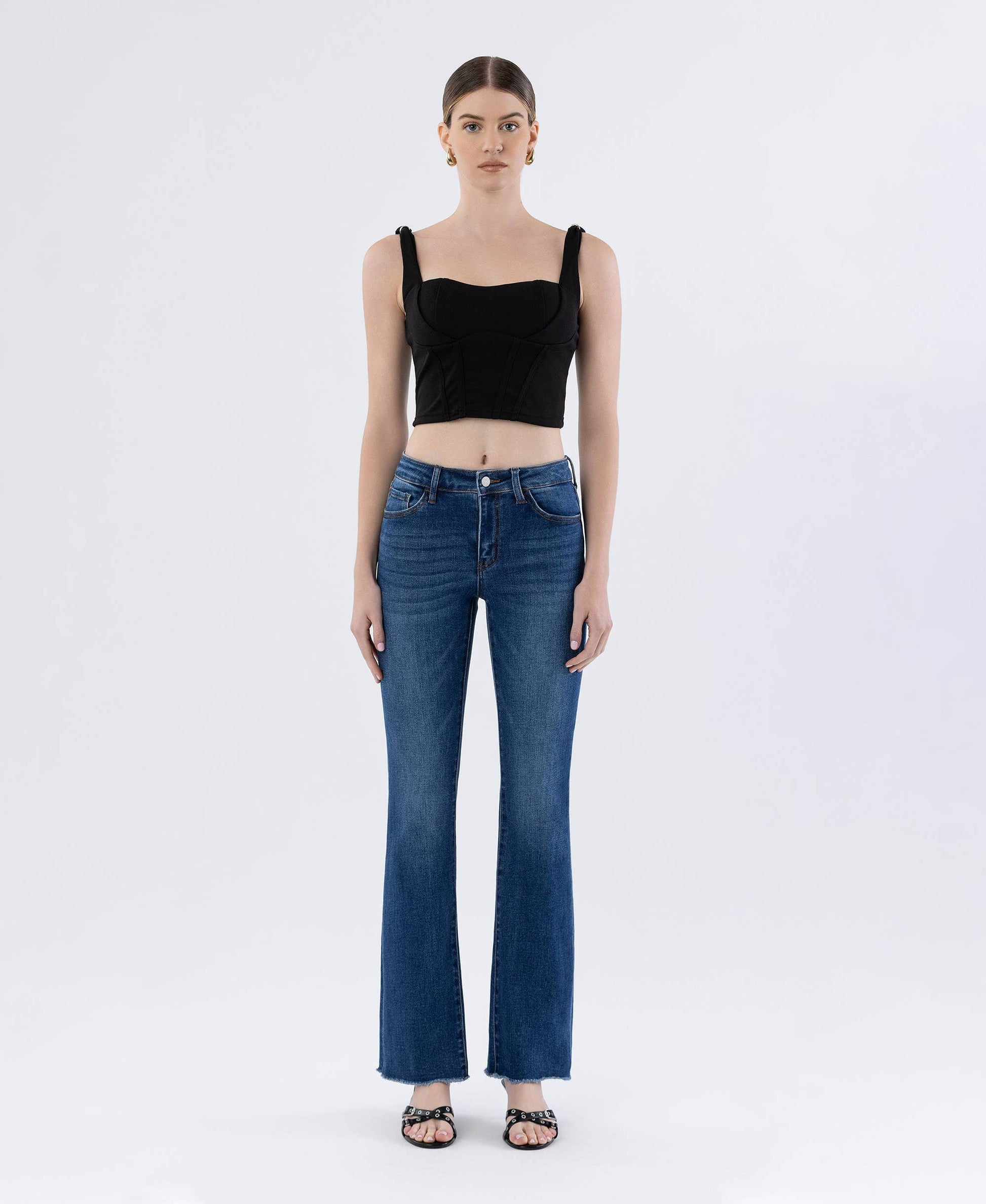 MID RISE RAW HEM DARK WASH BOOTCUT JEANS