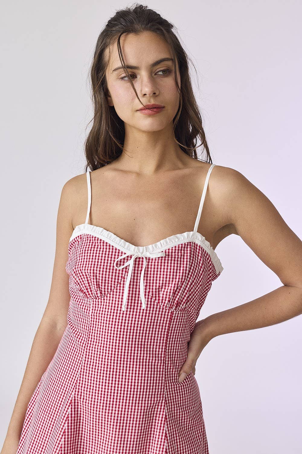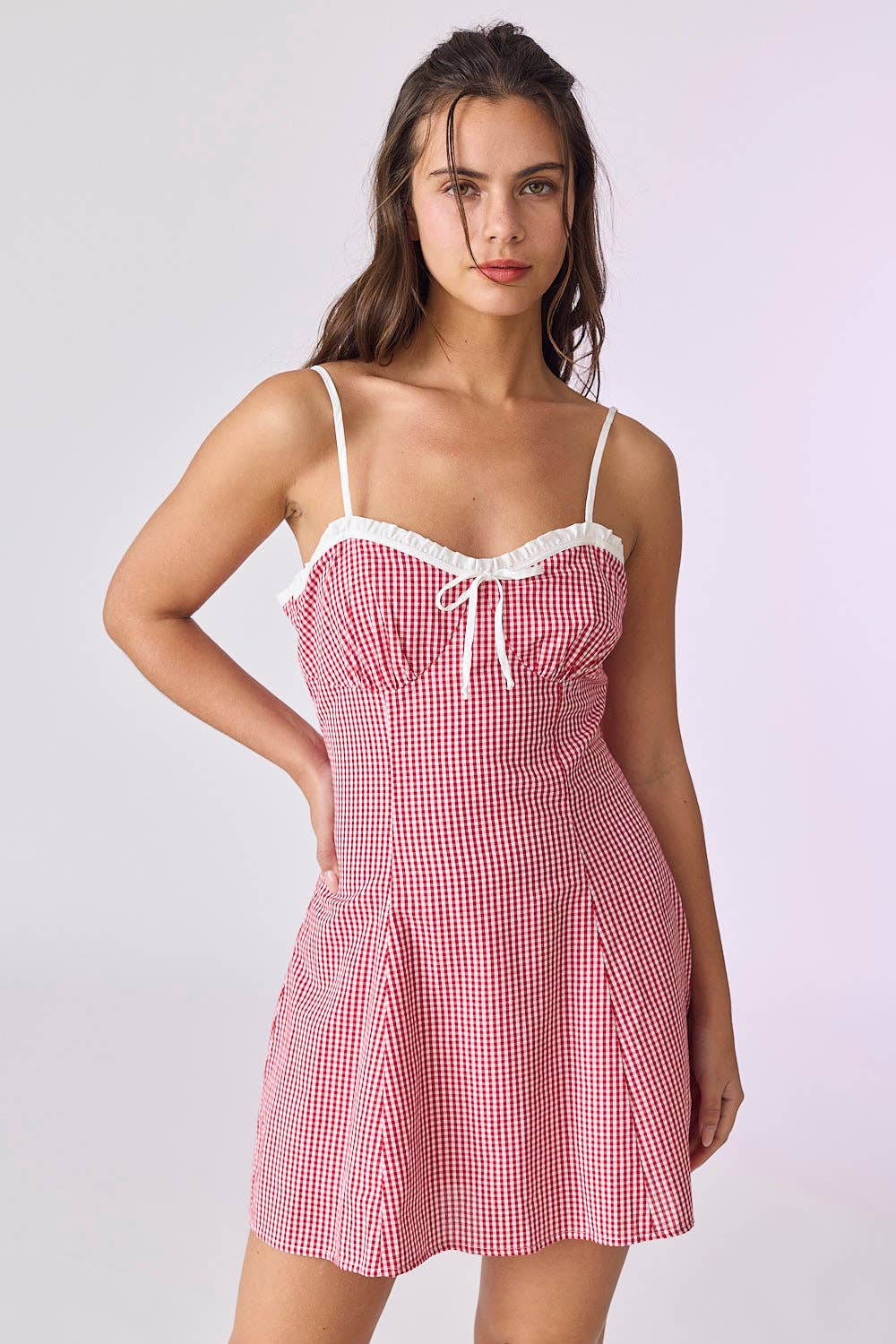 Gingham Tie Front Mini Dress Sweet and playful mini dress with classic gingham pattern and flirty tie front detail Fitted bodice with soft flare skirt creates a flattering silhouette Delicate straps and ruffle trim add feminine charm Perfect for warm weather styling Highlights - Fitted bodice with tie front accent - Soft flare mini skirt for easy movement - Adjustable shoulder straps - Ruffle trim neckline detail - Lightweight fabric for spring and summer Perfect For - Weekend brunch dates - Picnics and outdoor events - Everyday casual looks - Layering with cardigans orĀ denimĀ jackets Model's height is 5' 8" and wearing a size S