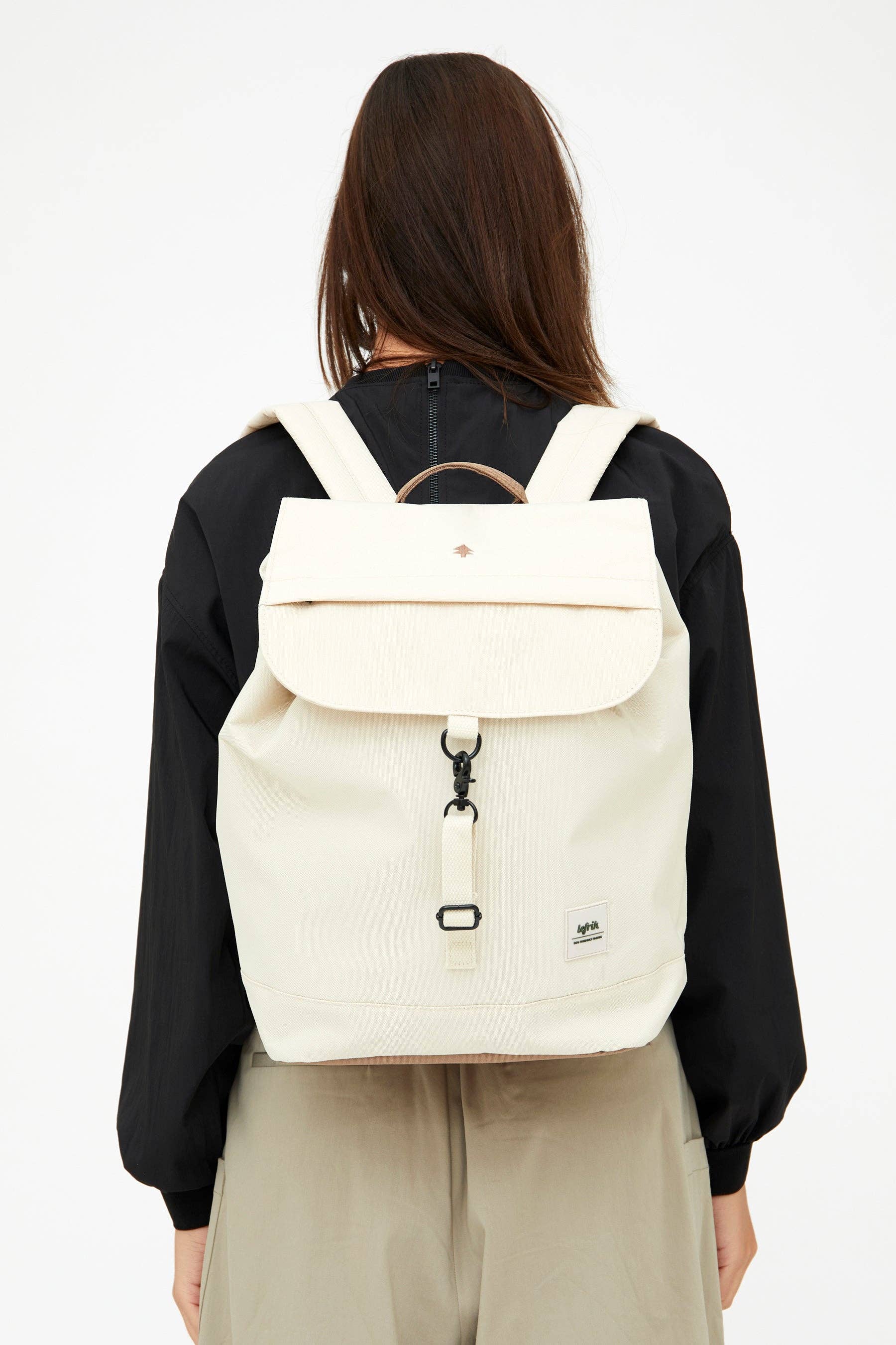 Its rounded silhouette and large flap closure define the brand's most iconic model. This 19L capacity backpack features a large main compartment, a padded laptop pocket for laptops up to 13.6", and two separate organisers for small items. It also has an interior bottle pocket, a quick access pocket on the flap, and a security pocket on the back. Padded, adjustable handles. Front fastening with metal hook. Its OXFORD RPET fabric makes it lightweight, water resistant and vegan. Wash cold. Air dry.