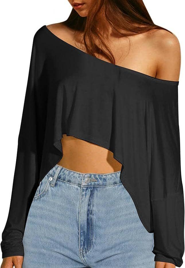 This solid slanted shoulder crop top T-shirt is a stylish and versatile addition to any wardrobe. Made from soft and breathable fabric, it offers a comfortable fit and a trendy slanted shoulder design. Pair it with high-waisted bottoms for a chic and modern look.